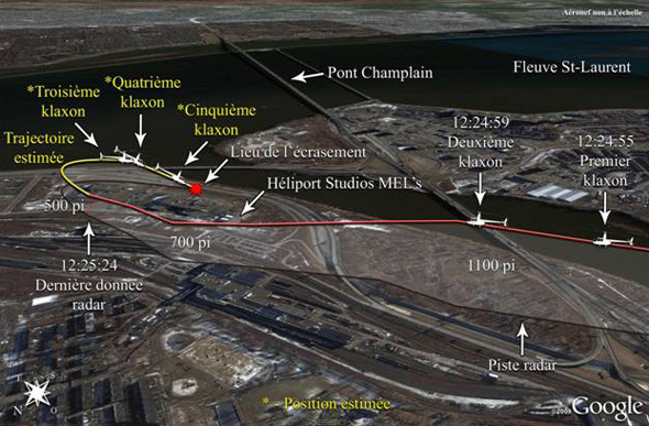 Lorsque le klaxon bas Nr a retenti, l'hélicoptère survolait un quartier industriel parsemé de sites propices à un atterrissage d'urgence sécuritaire. Ces sites d'atterrissage comprenaient des stationnements, des routes d'accès, des terrains vagues, des champs, dont l'héliport des Studios Mel's. Au moment des faits, le sol était enneigé et le ciel était couvert. Dans de telles conditions, il est difficile d'évaluer la profondeur du relief en raison d'un manque de perspective.