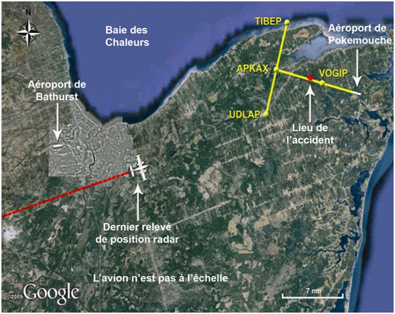 CDA4 est un aérodrome certifié situé dans un espace aérien non contrôlé à 68 pieds asl. La seule approche publiée de la piste 13 est une approche RNAV (GNSS) (voir l'Annexe B). L'altitude minimale de sécurité dans les 25 nm de l'aéroport publiée sur la carte d'approche est de 1900 pieds asl. Lorsqu'un aéronef passe au-dessus du point d'entrée initial UDLAP, il peut descendre à une altitude minimale de 1600 pieds asl. Selon la dernière indication de position radar, il aurait fallu que l'avion, qui évoluait à environ 15 nm d'UDLAP à une altitude de 4400 pieds asl et à une vitesse sol de 180 nœuds, atteigne un taux de descente d'environ 500 pieds par minute pour franchir UDLAP à 1900 pieds dans le cadre de l'approche GPS. Une fois qu'un aéronef atteint APKAX, il peut descendre à 1000 pieds asl jusqu'à ce qu'il soit à 4 nm de l'aéroport, après quoi la descente finale peut être amorcée. Le relief le plus haut entre APKAX et la piste 13 s'élève à 130 pieds asl. Il existe 2 autres approches publiées pour l'aéroport de Pokemouche, une approche GPS et une approche par radiophare non directionnel (NDB), toutes deux pour la piste 31. L'altitude minimale de descente pour les 3 approches est de 680 pieds asl.