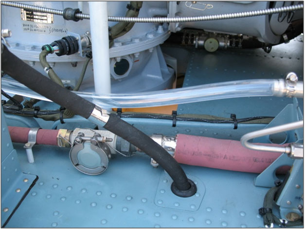 On a réexaminé l'hélicoptère et on a déposé tout le circuit carburant basse pression, avant de l'envoyer à l'atelier technique du BST de la région du Centre afin d'effectuer des examens et des essais plus détaillés (voir la figure 1). Pour ces essais, on a remplacé les conduites carburant par des conduites en plastique transparent du même diamètre intérieur, afin de permettre de bien voir le débit du carburant dans le circuit.