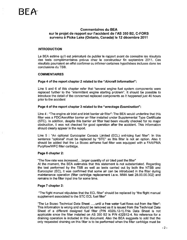 Parallèlement à cette enquête, le 19 décembre 2010, le National Transportation Safety Board (NTSB) a commencé à enquêter sur l'hélicoptère AS 350 B2 (portant l'immatriculation N549AM et le numéro de série 4339), lequel avait subi une perte de puissance moteur à LaMonte (Missouri), aux États–Unis (rapport d'accident no CEN11LA118 du NTSB). Pour faciliter les essais communs, le BST et le NTSB ont partagé l'information entourant ces 2 accidents. Le moteur Arriel 1D1 de Turbomeca dans cet accident a fonctionné sans que l'on décèle d'anomalie. Les circuits carburant des 2 hélicoptères de ces 2 accidents sont identiques, sauf en ce qui a trait au filtre antigivrage ECL. Les essais du circuit carburant effectués en soutien à l'enquête du NTSB ont donné des résultats similaires quant à l'introduction d'air et aux difficultés associées à la purge de l'air du circuit.