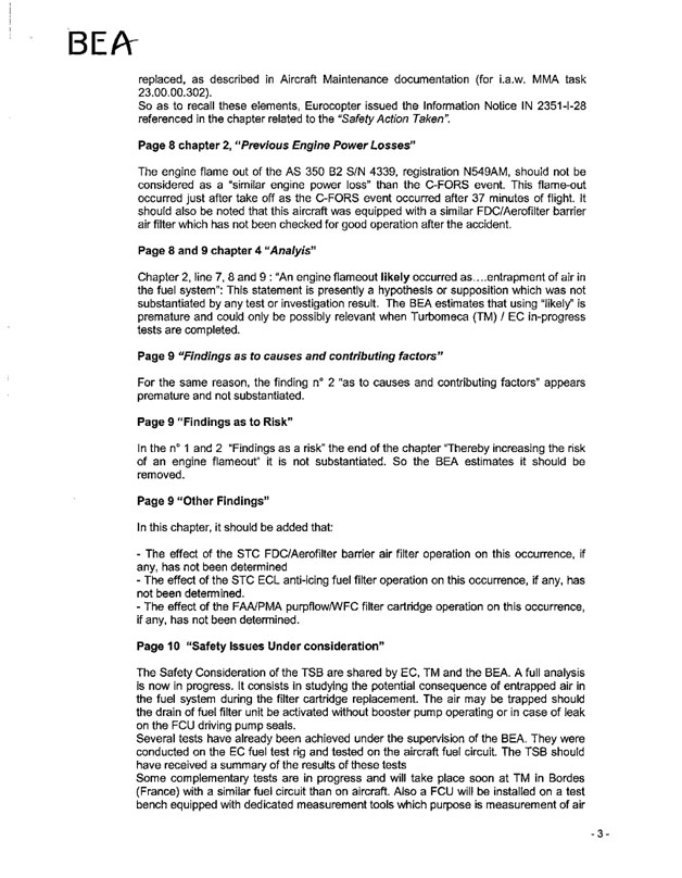 En raison des similitudes entre cet accident et l'enquête menée en parallèle par le NTSB, Eurocopter France a lancé un programme d'essais visant à vérifier si de l'air s'étant introduit dans le circuit carburant pouvait entraîner des difficultés de fonctionnement du moteur. Les essais ont été effectués conjointement avec Turbomeca, le motoriste, avec Le Bozec, le fabricant du filtre carburant basse pression, et avec le BEA (Bureau d'enquêtes et d'analyses), le bureau français d'enquête sur les accidents. Les essais ont commencé au printemps 2011, et d'autres essais ont été effectués sur le filtre carburant basse pression à l'automne 2011. Des essais d'ingestion d'air du moteur sont prévus à la fin de 2011, et une analyse complète est en cours.