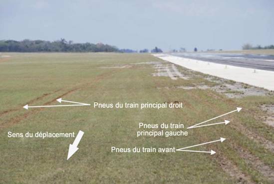 Par la suite, l'avion a roulé parallèlement à la piste selon un angle de crabe de 10° vers la gauche sur une distance d'environ 1745 pieds. Pendant ce temps, les moteurs sont passés en mode d'inversion de poussée. À environ 4300 pieds du seuil et alors qu'il roulait à une vitesse de 40 nœuds, l'avion est retourné sur la piste (voir la photo 1).