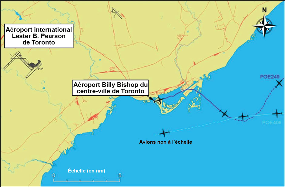 Pendant 10 secondes, un autre avion a occupé la fréquence. Au cours de cette période, POE249 et POE406 ont reçu des avis de résolution provenant de leurs systèmes respectifs de surveillance du trafic et d'évitement des collisions (TCAS) et ils s'y sont conformés. Quelques secondes plus tard, POE249 et POE406 se sont croisés avec un espacement vertical de 300 pieds, à 6 nm à l'est-sud-est de l'aéroport Billy Bishop (voir la figure 1).