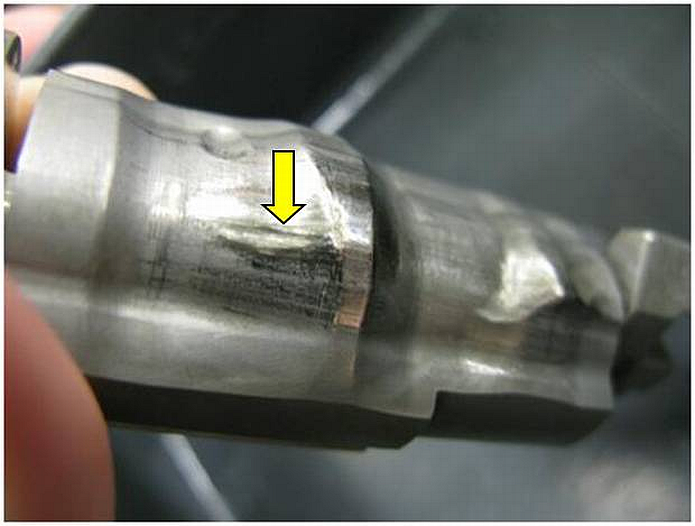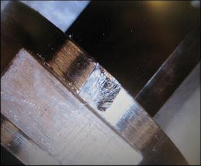 elon Hamilton Sundstrand, l’usure des contours de la came 3DNote de bas de page 12 au-delà des limites précisées dans le CMM peut entraîner des anomalies de gestion du carburant. Pendant le démontage du FCU en cause à l’installation du fabricant, on a observé une rainure d’usure signalée comme inhabituelle sur la came 3D (photo 6). Cependant, aucune anomalie de gestion du carburant antérieure n’avait été signalée ou inscrite dans le carnet de route de l’hélicoptère en cause. En conséquence, la came 3D a été envoyée au Laboratoire du BST, où l’on a évalué sa contribution possible à la perte de puissance subie pendant l’événement en question. Les essais effectués par le Laboratoire du BST ont permis de déterminer que l’usure se situait dans les limites précisées par le fabricant. Ce type d’usure était caractéristique d’une interaction solide contre solide entre la surface de la came 3D et celle des galets de came, ce qui indique que de petites particules métalliques étaient enlevées des surfaces de contact de la came et des galets.
