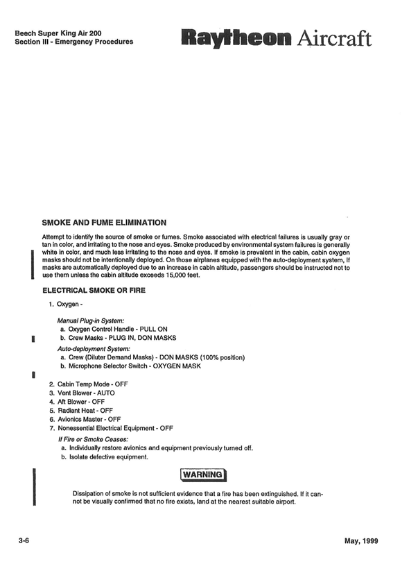 Il est à noter que le 6ième point indique de fermer le commutateur principal du système d'avionique, ce qui aurait coupé l'alimentation électrique aux aides à la navigation utilisée pour l'approche. Dans le poste de pilotage, il n'existe pas d'interrupteur dédié aux lumières de lecture dans la cabine puisqu'elles sont actionnées séparément par chacun des passagers. Un disjoncteur « Cabin » de 10 ampères, situé sur le côté droit du poste de pilotage, est dédié à l'éclairage de la cabine. L'équipage n'a pas tiré de disjoncteurs et la liste de vérification ne l'exige pas. Rien n'indique que des disjoncteurs se sont déclenchés suite à l'apparition de fumée et de feu. La procédure d'urgence inclut une note d'avertissement qui indique que la dissipation de fumée n'est pas une indication suffisante afin d'attester que le feu a été éteint. Même s'il est impossible de confirmer visuellement qu'il n'y a plus de feu, il faut atterrir à l'aéroport convenable le plus près.