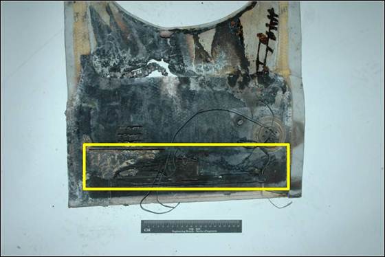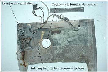 Le coin supérieur gauche du panneau LH/5 a été légèrement incendié. Le boîtier en plastique de la bouche de ventilation servant à distribuer l'air était entièrement fondu ainsi que l'isolant des fils. Il y avait un dépôt de suie sur une grande partie de la section supérieure du panneau (voir la photo 3). Une bande de tissu sur le côté gauche supérieur a été partiellement incendiée et une grande partie de la bande située en haut du panneau était recouverte de suie. Le devant du panneau n'avait aucune trace de brûlure. Les fils endommagés par l'incendie ne démontraient aucune preuve de brûlures causées par un arc électrique.