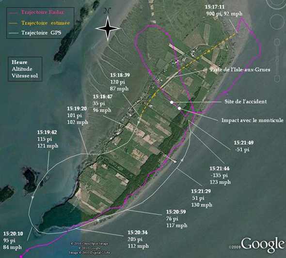 L'appareil poursuit son vol en suivant la rive sud de L'Isle-aux-Grues en vue d'effectuer le circuit pour la piste 25 (voir l'annexe A, trajectoire GPS et radar)Note de bas de page 2. À la hauteur de l'aéroport, le Cessna effectue une boucle au-dessus de la piste avant d'entreprendre le parcours vent arrière gauche. À environ 1 nm au nord-est du seuil de la piste, l'appareil commence le parcours de base. À 15 h 17, il disparaît de l'écran radar au moment où il amorce l'approche finale à 1 nmde la piste et 900 pieds asl.