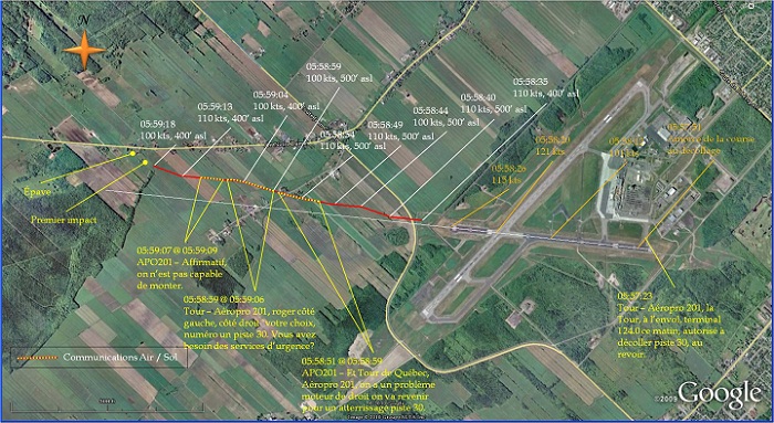 APO201 apparaît sur l’écran du radar de Québec à environ 800 pieds au-delà du bout de la piste et à 160 pieds au-dessus du niveau du sol (agl)Footnote 3 à une vitesse de 110 nœuds (Figure 1). Cinq secondes plus tard, l’aéronef bifurque de quelque 10° à droite; l’aéronef se trouve à 260 pieds agl, l’altitude maximale atteinte durant le vol, et sa vitesse est inchangée. Quelques secondes plus tard, le copilote avise le contrôleur de l’aéroport qu’il éprouve un problème avec le moteur droit et signale son intention de revenir atterrir sur la piste 30. Aussitôt, le contrôleur informe APO201 qu’il a priorité pour l’atterrissage et demande s’il a besoin des services d’urgenceFootnote 4. Sans délai, le copilote annonce que l’aéronef est incapable de monter. C’est la dernière transmission d’APO201.