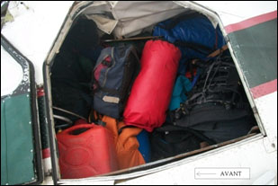 Afin d'établir le poids de l'aéronef avec le plus de précision lors du décollage, les bagages ont été récupérés le soir de l'évènement et ils ont été déposés dans un endroit sec et surveillé. Ils ont été pesés le lendemain après–midi. Le poids total des bagages, incluant les 6 contenants de carburant, totalisait presque 900 livres. À ce poids, il faut ajouter le canot de 70 livres.