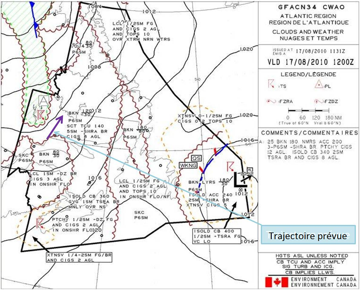 La région du vol, au nord de Sept-Îles, était recouverte d'une zone nuageuse liée à l'approche d'un front froid qui se déplaçait vers l'est. Selon la carte de prévision de zone graphique valide à 8 h, la zone nuageuse était constituée entre autres d'une couche nuageuse fragmentée à 3000 pieds agl et une visibilité de 6 sm (Annexe B). On y retrouvait également des cumulus bourgeonnants épars ayant des sommets pouvant atteindre 14 000 pieds, créant un risque d'averses de pluie légère et de la brume qui pourraient réduire la visibilité à 5 sm et des plafonds à 800 pieds agl. Toutefois, l'image radar de la région du vol ne démontre pas d'échos qui pourraient indiquer la présence de cumulus bourgeonnants dans la région. Aucun AIRMETFootnote 12 ni SIGMETFootnote 13 n'ont été émis pour la région le jour de l'accident.