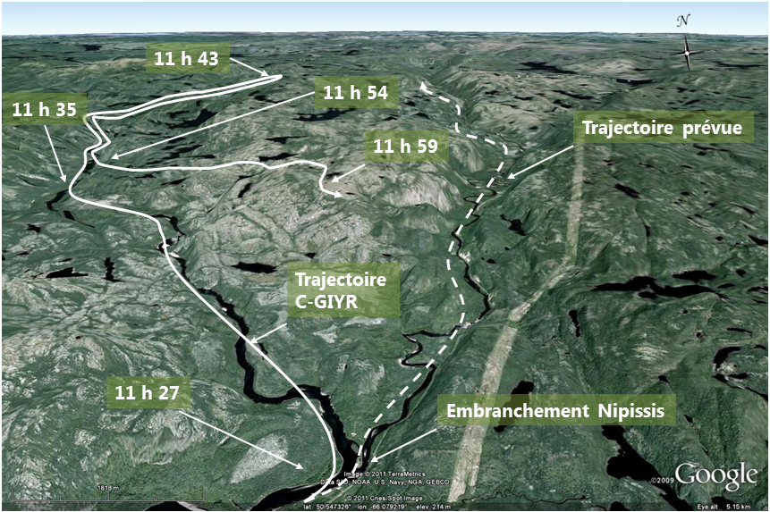 - Pour des raisons inconnues, le pilote n'a pas pris l'embranchement de la rivière Nipissis, mais a dû éventuellement rebrousser chemin en raison des nuages qui couvraient le relief. Ce prolongement du vol a réduit l'autonomie en carburant disponible pour se rendre à destination.