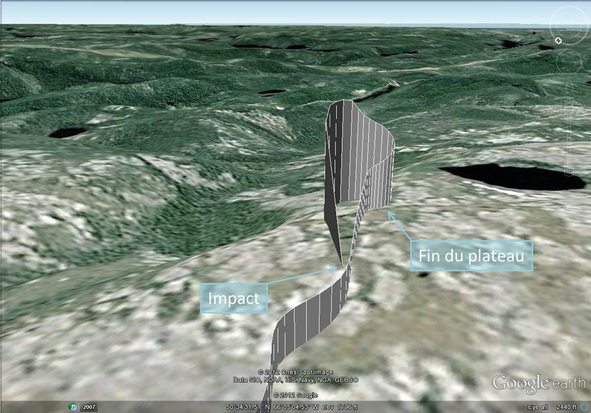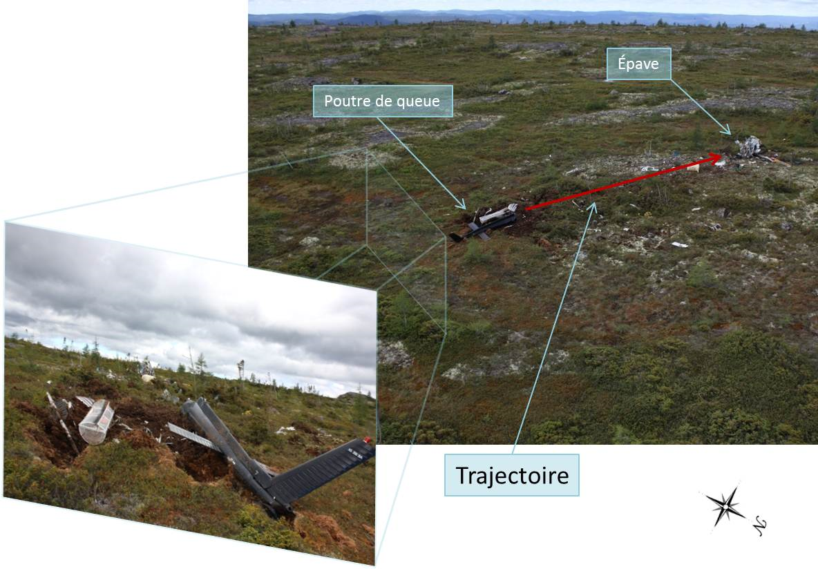 À 12 h 01 min 5 s, l'hélicoptère atteint l'extrémité sud-est du plateau, où le sol descend rapidement en direction de la vallée de la rivière Moisie. L'hélicoptère amorce une montée qui culmine environ 300 pieds au-dessus du plateau en virage à gauche, et moins de 4 secondes plus tard, l'appareil percute le sol à un angle prononcé en direction nord-ouest (Figure 3). L'accident survient à 12 h 01 min 37 s.