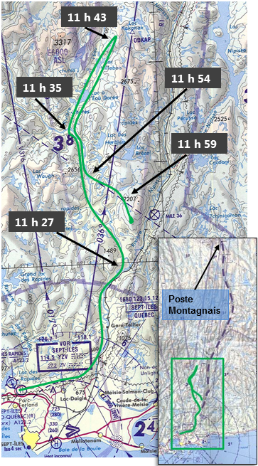 À 11 h 35, le pilote cesse de suivre la rivière Moisie et emprunte une vallée à sa droite en direction nord-est vers le Poste Montagnais. À 11 h 43, il fait demi-tour pour revenir à la rivière Moisie et la suivre à nouveau, mais en direction sud. Le demi-tour s'effectue à une altitude d'environ 1900 pieds au-dessus du niveau de la mer (asl), où la cime des montagnes atteint plus de 2000 pieds.