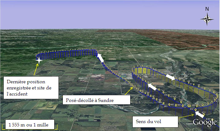 L'aéronef a quitté Springbank (CYBW) à 13 h 19Footnote 1, pour un vol d'une durée prévue de 1,5 heure. L'aéronef s'est dirigé vers le nord-ouest, à destination de l'aéroport de Sundre (CFN7), à 40 milles marins (nm) au nord de Springbank, à une altitude maximale de 6500 pieds au-dessus du niveau de la mer (asl), et à une vitesse sol maximale de 160 nœuds. Une descente a été amorcée à 21 nm au sud-est de CFN7. En raison de la dissimulation par le terrain, le dernier signal de retour de contrôle de la circulation aérienne produit par la source radar de Calgary, à 13 h 36, indique que l'aéronef C-FGLA descendait à une altitude de 5700 pieds asl.