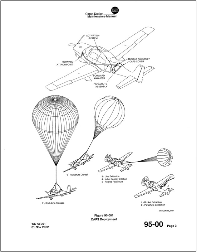 Le C-FGLA a été doté, en usine, d'un extracteur de parachute de cellule Cirrus (CAPS), offert comme matériel standard à bord de tous les aéronefs fabriqués par Cirrus. Il est conçu pour protéger les occupants en abaissant l'avion au sol en cas de situations d'urgence en vol; notamment une collision en vol, une défaillance de structure, une perte de maîtrise, un atterrissage en terrain inhospitalier et une incapacité du pilote (voir l'annexe C). Le système se compose d'un parachute de 2400 pi² qui est fixé à l'aéronef et dont l'ouverture est provoquée par une roquette. Le manuel d'utilisation à l'intention des pilotes indique que le système est activé manuellement : il suffit de saisir à deux mains une poignée en T située au plafond et de l'abaisser d'un mouvement énergique et soutenu. Une force de traction égale ou supérieure à 45 livres peut être requise. La poignée est verrouillée au moyen d'une goupille de sécurité lorsque l'aéronef est au sol. On peut s'attendre à ce que le support retenant la poignée se plie.