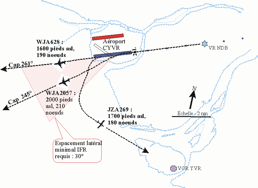À 23 h 03 min 36 s, le contrôleur d’aéroport, dont l’intention était de donner au vol JZA269 l’instruction de contacter le contrôle des départs, a une fois de plus utilisé le mauvais indicatif d’appel : « WestJet 269 » (annexe A). Il a fallu plusieurs transmissions entre le contrôleur d’aéroport et le vol JZA269 pour clarifier l’instruction, après quoi le vol JZA269 a accusé réception du changement de fréquence. Le contrôleur d’aéroport, qui avait l’intention de transférer le vol WJA2057 à la fréquence de départ, a encore une fois confondu les indicatifs d’appel des aéronefs et utilisé « Jazz 2057 ». On n’a pas accusé réception de cette instruction, et le vol WJA2057 est resté sur la fréquence du contrôleur d’aéroport. À 23 h 04 min 13 s, le contrôleur d’aéroport a donné instruction au vol WJA628, maintenant à 3,8 nm de l’extrémité de départ de la piste 26L et franchissant 2700 pieds en montée, de contacter le contrôle des départs. À ce stade, les vols WJA2057 et WJA628 avaient un espacement latéral de 1,6 nm et vertical de 700 pieds. Cette distance ne donnait pas l’espacement minimal selon les règles de vol aux instruments (IFR) exigé par le MANOPS ATC. L’espacement minimal exigé aurait été un espacement latéral de 3 nm, ou une différence de cap de 30°, jusqu’à ce qu’un espacement vertical de 1000 pieds soit atteint. À 23 h 04 min 23 s, le vol WJA628 franchissait 3200 pieds asl en montée jusqu’à son altitude autorisée de 7000 pieds asl.