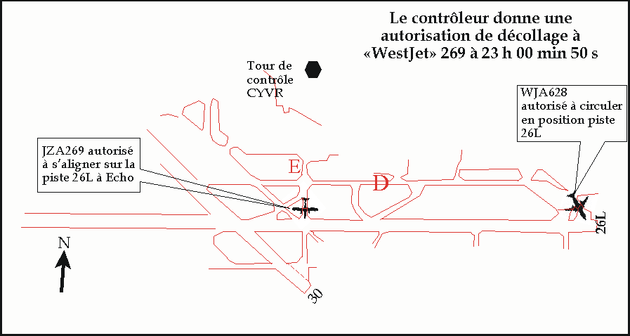 À 23 h 00 min 50 s, pendant que les vols WJA628 et JZA269 circulaient au sol pour se mettre en position sur la piste 26L, le contrôleur d’aéroport a donné une autorisation de décollage (figure 1). L’aéronef autorisé à décoller a été désigné comme « WestJet 269 », et l’autorisation comprenait l’instruction d’exécuter le SID Richmond 1. L’autorisation ne nommait pas d’intersection de voie de circulation et de piste, comme l’exige le Manuel d’exploitation du contrôle de la circulation aérienne (MANOPS ATC) de NAV CANADA. À 23 h 00 min 58 s, l’équipage de conduite du vol WJA628 a répété l’autorisation de décoller et a remis en question le changement de SID de Georgia 2 à Richmond 1. Le SID Richmond 1 est conçu pour être utilisé seulement par des aéronefs autres que des aéronefs à réaction. Cinq secondes plus tard, l’équipage de conduite du vol JZA269 a avisé la tour que l’aéronef était aligné sur la piste 26L. Le contrôleur d’aéroport, se rendant compte qu’une erreur avait été commise, a ensuite autorisé le vol JZA269 à décoller, et a donné au vol WJA628 l’instruction d’attendre. L’autorisation de décoller du vol JZA269 ne comprenait pas l’intersection d’où l’aéronef partait. Les vols JZA269 et WJA628 ont accusé réception de l’autorisation et des instructions révisées. Ni l’un ni l’autre des aéronefs n’avait commencé une course au décollage à ce moment.