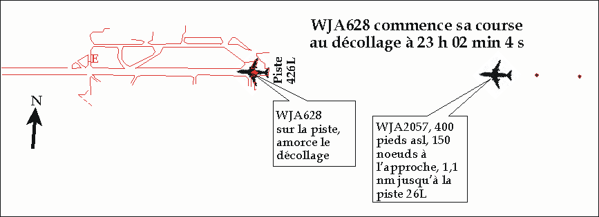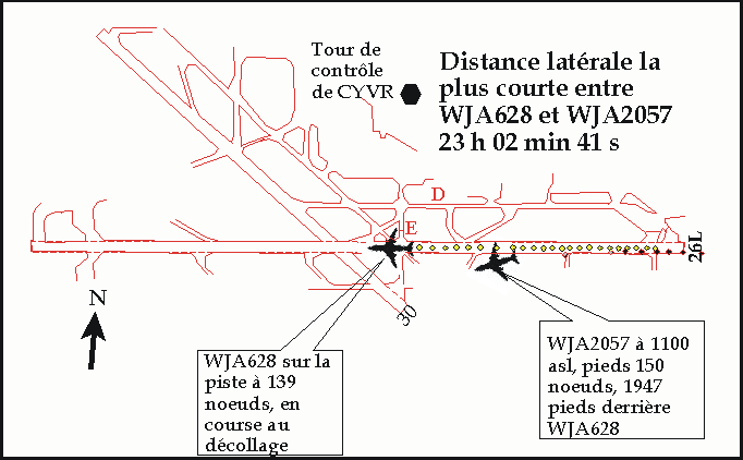 Le contrôleur d’aéroport a ensuite avisé l’équipage de conduite du vol JZA269 qu’un Boeing 737 allait virer sur un cap de 240° derrière lui à 2000 pieds asl. Quelques secondes plus tard, à 23 h 02 min 54 s, le contrôleur d’aéroport a donné au vol JZA269 l’instruction de se rendre directement vers la balise du radiophare omnidirectionnel à très haute fréquence (VOR) de Vancouver. Puis, à 23 h 02 min 56 s, le contrôleur d’aéroport a donné au vol WJA628 l’instruction de voler dans la direction du cap de piste. Le SID Georgia 2 aurait exigé que le vol WJA628 vire sur le cap 245 °M après avoir franchi 420 pieds asl en montée. Juste avant de franchir l’extrémité de départ de la piste 26L à 23 h 02 min 57 s, le vol WJA628 a franchi 400 pieds asl en montée à 7000 pieds asl. À ce stade, le vol WJA2057 était à 0,4 nm au sud-est du vol WJA628, franchissant 1800 pieds asl en montée à 2000 pieds asl. Le contrôleur d’aéroport a ensuite modifié le cap du vol WJA2057 au 245 °M. Quelques secondes plus tard, à 23 h 03 min 22 s, le contrôleur d’aéroport a avisé le contrôleur des départs que le vol WJA2057 effectuait une remise des gaz et montait à 2000 pieds asl sur un cap de 245 °M, et que le vol WJA628 avait reçu l’instruction de voler dans la direction du cap de piste.