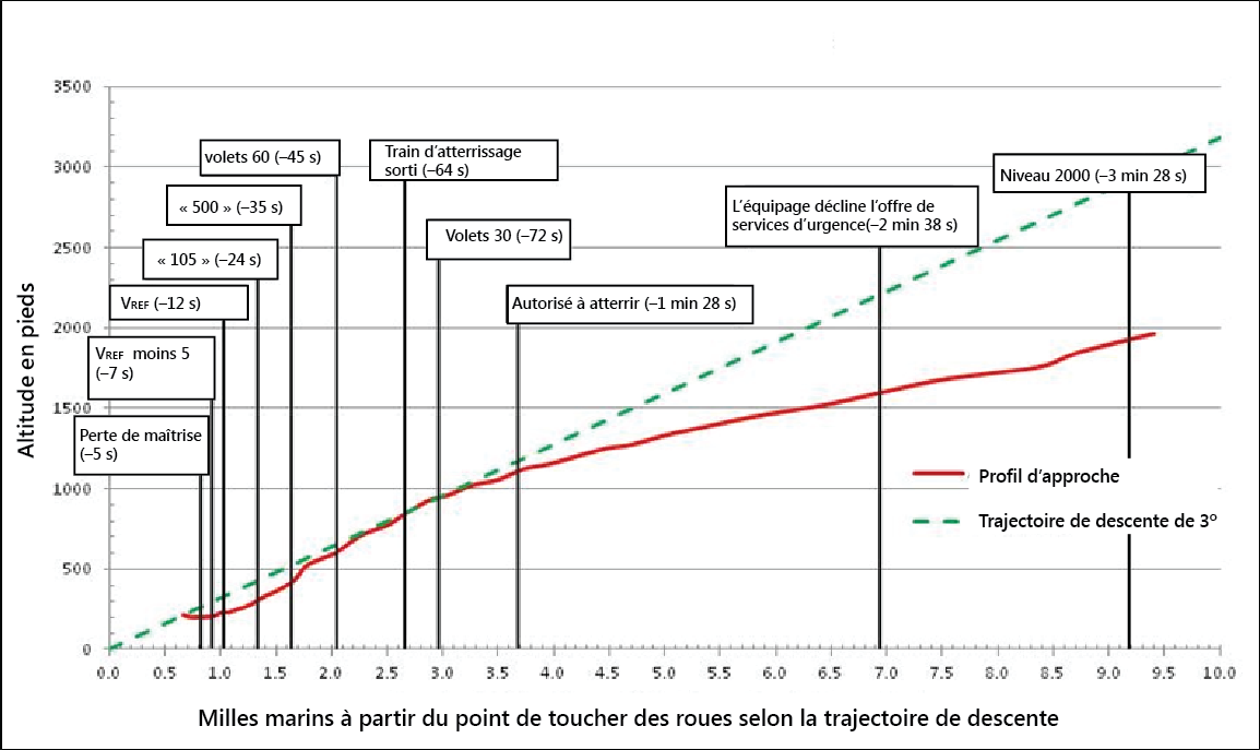 - Les procédures d’utilisation normalisées de l’entreprise étaient dépourvues de directives claires quant à la façon dont l’aéronef doit être configuré pour les 500 derniers pieds, ou sur ce qu’il faut faire lorsqu’une approche est encore instable lorsqu’il reste 500 pieds à parcourir, en particulier en situation anormale. Le risque que se produisent des accidents durant les approches non stabilisées à une altitude inférieure à 500 pieds au-dessus du niveau du sol a été démontré.