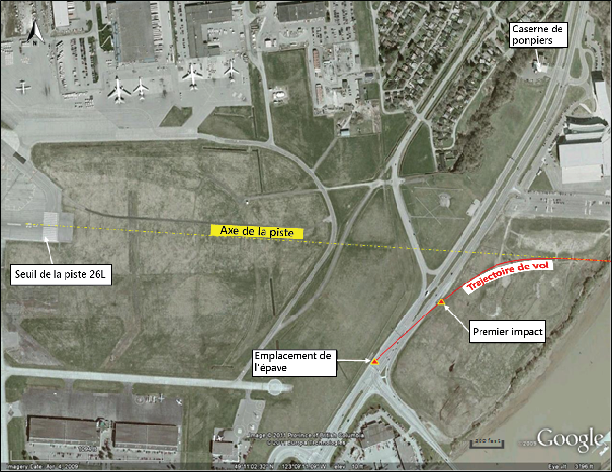 L’aéronef a heurté le sol sur une artère principale, tout juste à l’extérieur de la clôture délimitant le périmètre de l’aéroport. L’accident s’est produit à un moment où, en raison de la signalisation des feux de circulation, les véhicules étaient immobiles. Plusieurs personnes étaient arrêtées aux feux de circulation et ont porté secours aux passagers. Lorsque l’avion s’est immobilisé, le passager assis près de la porte principale a essayé à plusieurs reprises d’ouvrir la porte avant d’y parvenir. Ce passager a ensuite aidé le passager le plus près à sortir, et les personnes se trouvant sur les lieux ont aidé tous les passagers, sauf un, à sortir de l’avion en flammes. Le poste de pilotage était le plus éloigné de la porte, et les premiers intervenants n’étaient pas au courant du nombre total de personnes à bord. Après que 6 des passagers ont été évacués de l’aéronef, l’incendie a empêché les premiers intervenants de rejoindre le septième passager, qui était assis à l’avant de l’aéronef. Après avoir été avisé de l’accident de manière informelle, le personnel de lutte contre les incendies de Richmond est arrivé environ 3 minutes après l’écrasement, en provenance d’un poste de pompiers situé à environ 700 mètres du lieu de l’accident. Ils ont secouru le septième passager. L’aéronef se trouvait dans un fossé, juste à l’extérieur de la clôture périphérique de l’aéroport. Un camion de pompiers de l’aéroport de Vancouver est arrivé environ 4 minutes après l’écrasement, après avoir été dépêché sur les lieux par l’ATC. Il a pu arroser l’épave à partir du côté opposé de la clôture de l’aéroport. Un second camion de pompiers de l’aéroport a défoncé la clôture du périmètre de l’aéroport afin de se rendre sur les lieux de l’accident. Il régnait une certaine confusion quant au nombre total de personnes à bord et au nombre de pilotes; toutefois, les membres du personnel du service de sauvetage et de lutte contre les incendies ont pu éteindre le feu, couper l’épave et secourir les pilotes.