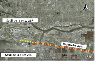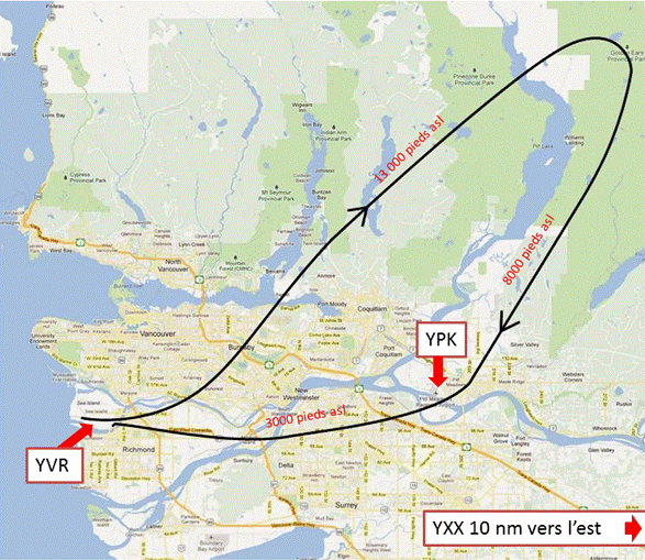 CYVR est situé en banlieue de Vancouver, sur une île à l’embouchure du fleuve Fraser, au niveau de la mer. Il s’agit d’un aéroport international offrant un service complet et un soutien aux principales compagnies aériennes. Il y a 3 surfaces de piste, dont 2 sont parallèles. L’approche a été effectuée sur la piste 26L (Figure 3. Trajectoire du vol NT204). Parmi les autres aéroports des environs, il y a Pitt Meadows (CYPK) et Abbotsford (CYXX), comme l’indique la figure 7.