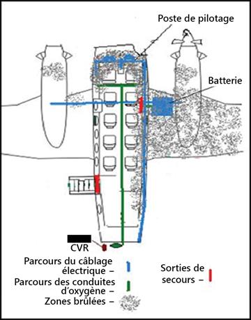 - Le circuit électrique endommagé a continué d’être alimenté par la batterie, ce qui a entraîné la formation d’arcs électriques qui ont déclenché des incendies, dont celui dans le poste de pilotage.
