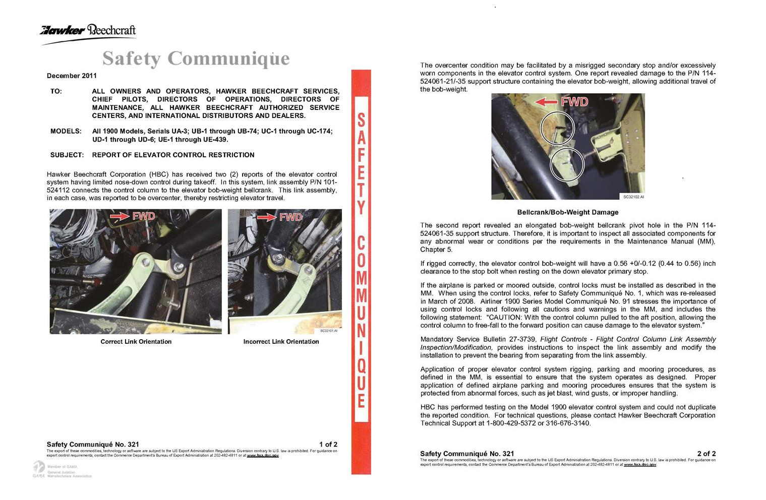 Dans le communiqué no 91 relatif au modèle, HBC reconnaît que le problème de sécurité tient au fait que le contrepoids d'équilibrage passe au-delà du boulon de butée et qu'il est bloqué. Dans les 3 rapports de difficultés en service (RDS), tous les exploitants désignent le passage du contrepoids d'équilibrage au-delà du boulon de butée comme un problème de sécurité. Ce même problème de sécurité est désigné comme condition dangereuse dans la consigne de navigabilité urgente 2011-27-51. Dans les événements mettant en cause Pacific Coastal et EVAS, les couplages à bielle étaient passés au-dessus du centre en raison des gestes posés par l'équipage de conduite pour débloquer la commande de profondeur coincée.