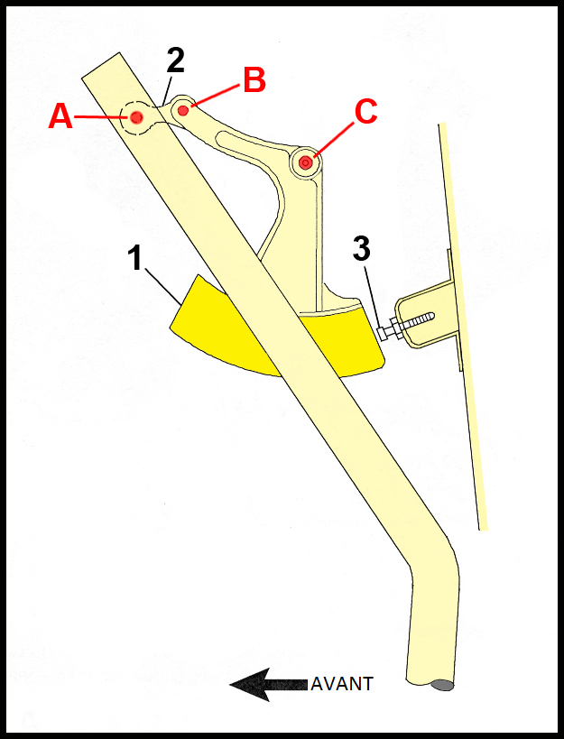 - La conception de la ferrure du boulon de butée permettait au contrepoids d'équilibrage de se déplacer au-delà de sa plage normale de fonctionnement. Ainsi, le manche était bloqué au fond vers l'avant parce que le contrepoids d'équilibrage était coincé contre le boulon de butée.