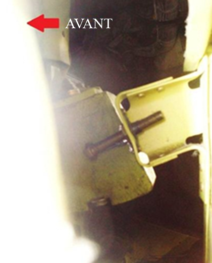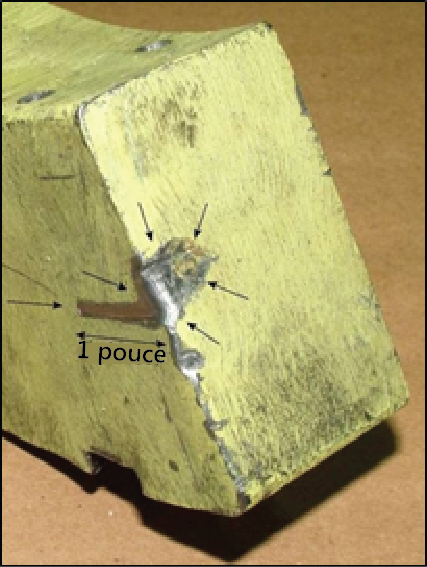 Des dommages ont été décelés sur le contrepoids d'équilibrage, la face arrière de la structure de fixation du guignol de contrepoids d'équilibrage et la ferrure du boulon de butée. La face de la ferrure du boulon de butée était déformée vers l'arrière et à la droite (voir section 1.6.2).