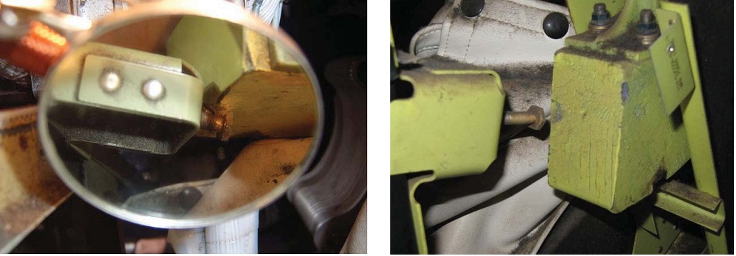 EVAS a repositionné le contrepoids d'équilibrage en incurvant le boulon de butée vers la gauche et en déplaçant le contrepoids d'équilibrage vers l'arrière au-delà de sa course normale (photo 2). Après l'alignement, on a constaté que le dommage était caractéristique d'un frottement du contrepoids d'équilibrage contre le côté du boulon de butée.