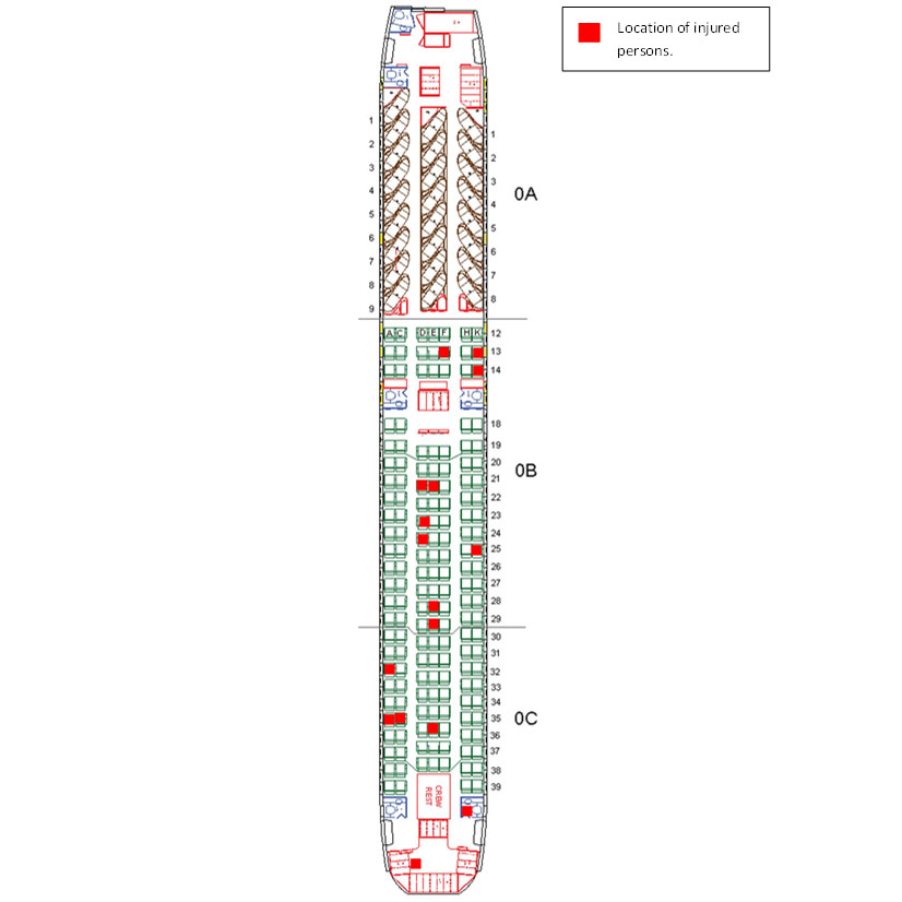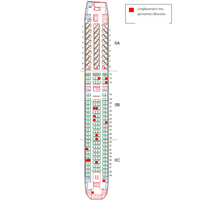 Le nombre total de passagers qui n'étaient pas assis avec leur ceinture de sécurité bouclée est inconnu. Aucun des passagers en classe affaire n'a été blessé. Les 14 passagers dont les blessures ont été examinées se trouvaient à divers endroits en classe économique (voir l'annexe A). Un des agents de bord blessés se trouvait dans l'office arrière, l'autre se trouvant dans le cabinet de toilettes. Toutes les blessures entraient dans la catégorie des lésions de tissus mous et un petit nombre de blessés ont subit des lacérations.