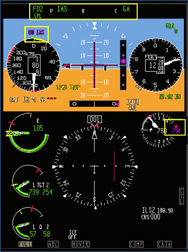 - Si la mention dans la partie supérieure du PFD est affichée en jaune, le pilote automatique ne s'est pas couplé au mode sélectionné même si les barres du FD sont affichées, et le pilote doit toujours piloter de mode manuellement.
