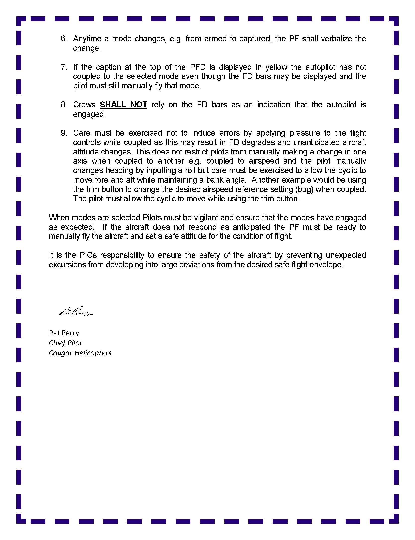 En 2013, Sikorsky a émis la révision temporaire 11 visant le Manuel de vol de giravion (RFM) du S-92A. La révision exige des exploitants de S-92A qu’ils incorporent dans le RFM les renseignements suivants à l’égard de l’utilisation du directeur de vol couplé :