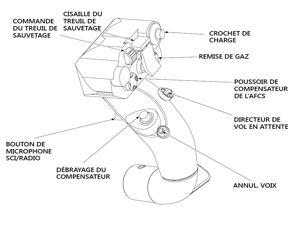 Le commandant est demeuré aux commandes pour le départ. Après avoir terminé un exposé de départ complet, le commandant a appuyé sur le bouton de débrayage du compensateur d’effort cycliqueFootnote 7 (figure 1) et à 14 h 57 min 27 s, a mis l’hélicoptère en vol stationnaire 10 pieds au-dessus de l’hélisurface. L’hélicoptère a ensuite été tourné vers la gauche afin de pouvoir effectuer un départ au vent s’éloignant du Sea Rose. Le levier de collectif a ensuite été augmenté pour amorcer une montée verticale en conformité avec la procédure de décollage d’une installation de forage de catégorie A de Cougar Helicopters.