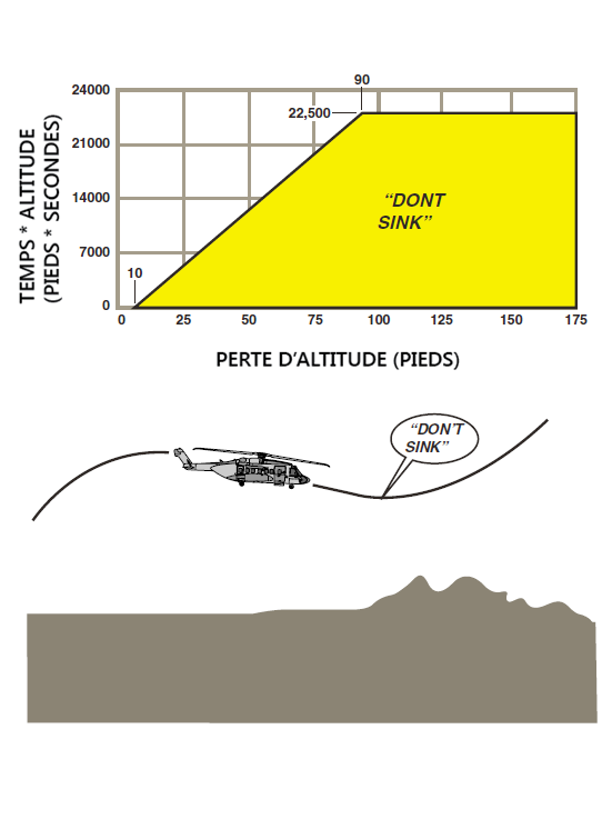 Alors que l’aéronef commençait à descendre dans une assiette de cabré à basse vitesse anémométrique, le premier officier s’est rendu compte de l’écart par rapport au profil type de vol et a commencé à faire des annonces d’écart d’assiette et de vitesse anémométrique. Le commandant, dont l’attention était concentrée sur l’indicateur d’assiette, a accusé réception de ces annonces d’écart et a indiqué que des mesures correctives seraient prises. À 14 h 58 min 28 s, alors que l’hélicoptère descendait sous 454 pieds asl (437 pieds altitude radar), le système d’avertissement de proximité du sol amélioré (EGPWS) de l’hélicoptère a déclenché une alerte sonore automatisée « Don’t Sink » pour les pilotes, qui a retenti pendant 11 secondes. Le taux de descente à ce moment était de 1375 pi/min. Pendant la descente, le premier officier a fait des annonces d’assiette et de vitesse anémométrique à au moins 2 autres reprises et a aussi conseillé au commandant d’abaisser le nez de l’hélicoptère. Le commandant a accusé réception de ces annonces et a avisé le premier officier que la correction était en cours. Pendant la descente, le commandant a tenu enfoncé le bouton de débrayage du compensateur d’effort cyclique, et a tenté d’abaisser le nez de l’hélicoptère en exerçant une pression graduelle vers l’avant sur le cyclique. Le déplacement graduel du cyclique vers l’avant a permis de réduire l’assiette en tangage de l’hélicoptère très lentement d’un maximum de 23° en cabré à environ 10° en cabré juste avant que l’appareil descende sous la base des nuages.