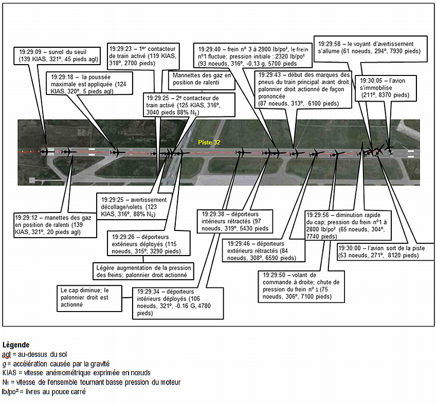 À 15 h 30, la roue avant a quitté la surface revêtue de la piste, à 8120 pieds du seuil, en suivant un cap au 271 °M, au moment où l’avion filait à environ 53 nœuds. L’avion s’est immobilisé juste à gauche de la surface pavée, pointant vers le cap 211 °M. Une fois l’appareil immobilisé, l’équipage de conduite a suivi la procédure d’arrêt d’urgence décrite dans le manuel de référence rapide (QRH) et a communiqué avec l’agent de bord pour s’informer de l’état des passagers. L’équipage a déterminé qu’il n’y avait pas de menace immédiate et a décidé de retenir les passagers à bord.