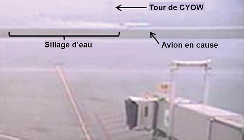 Avant l’accident, il avait plu pendant 10 minutes. Pendant la phase d’approche, la pluie s’est intensifiée à l’aéroport international Macdonald‑Cartier d’Ottawa (CYOW). Selon l’Organisation de l’aviation civile internationale (OACI), une piste est contaminée si l’épaisseur de l’eau qui la recouvre est supérieure à 3 mm. L’épaisseur estimée de la pellicule l’eau sur la piste 32 au moment de l’atterrissage était de 4 à 6 mm, ce qui correspond à une piste contaminée, selon la définition de l’OACI.