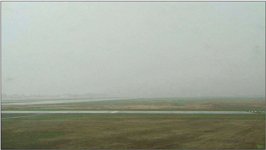 L'Unité de gestion des eaux pluviales de la ville d'Ottawa dispose d'un système automatique de mesure de la quantité de pluie. Certains éléments de ce système se trouvent à proximité de la tour de contrôle de CYOW, adjacents à la piste 14/32. Le système est muni d'un pluviomètre à auget basculeur qui transmet des impulsions électroniques à un système d'enregistrement informatisé. Les données ne sont pas communiquées au bureau d'observation météorologique de CYOW. Entre 15 h 20 et 15 h 29, heure de l'atterrissage, la hauteur totale de pluie accumulée était d'environ 10,2 mm. L'examen des données cumulatives aux 5 minutes relevées pendant cette période indique une intensité de pluie de 9,6 millimètres par heure (mm/h) durant les 5 premières minutes, d'environ 67,2 mm/h pendant les 5 minutes suivantes, et finalement, de 45,6 mm/h au moment de l'atterrissage. Le BST a calculé que, pendant la période entre l'atterrissage de l'avion et sa sortie de piste, cette piste était recouverte de 4 à 6 mm d'eau en moyenne (Photo 5 et Photo 6).