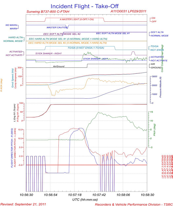 , et un commentaire indiquait qu’aucune urgence n’avait été déclarée, mais qu’on avait demandé que des équipes d’urgence soient sur place à l’atterrissage. Celles-ci ont suivi l’aéronef jusqu’à la porte d’embarquement. On a également indiqué qu’un avertissement de décrochage (activation du vibreur de manche) avait été précédé d’une indication de vitesse V1 non fiable.