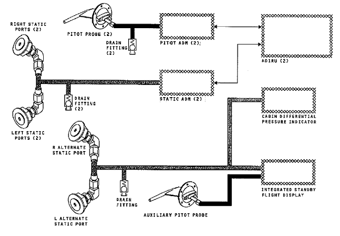 - Two primary systems, one on the left side of the airplane, the other on the right. Each system comprises a single pitot probe on the same side as the system connected to a pitot air data module (ADM) and two static ports, one on each side of the airplane, connected together to a static ADM. The ADMs convert the air pressure to an electrical signal that is sent to the respective air data inertial reference unit which calculates the values used in the respective primary flight display.