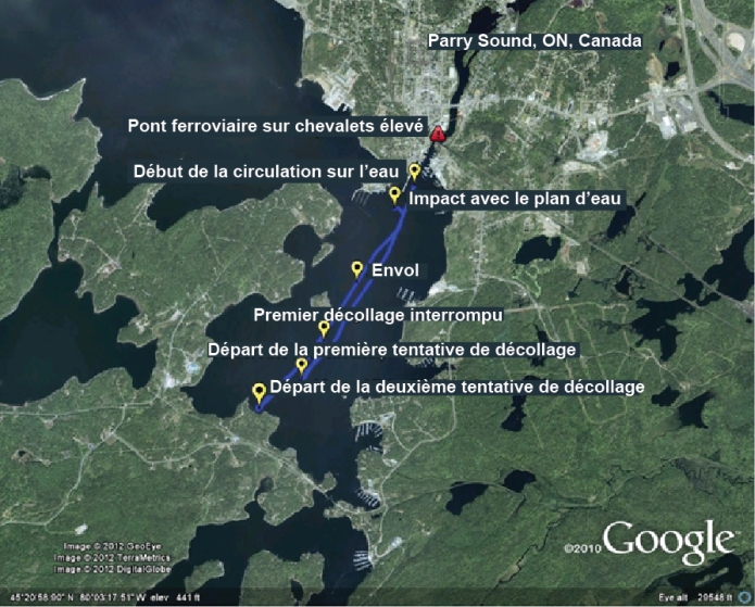 Le Found FBA-2C2 Bush Hawk-XP (immatriculé C-GYWK, numéro de série 41) exploité par Georgian Bay Airways était au décollage depuis la base d'hydravions de la compagnie à Parry Sound (Ontario) pour effectuer un vol de 32 milles marins vers un chalet isolé. L'aéronef avait 2 passagers et du matériel à bord. Le pilote a interrompu la première tentative de décollage, car l'aéronef n'a pas décollé assez rapidement. À la deuxième tentative, l'aéronef a décollé après une course d'environ 4200 pieds. Par la suite, pour éviter le relief qui approchait, le pilote a amorcé un virage à gauche vers un relief plus bas. Peu après avoir amorcé le virage, l'aile gauche et le nez ont piqué soudainement, et l'aéronef a percuté la surface de l'eau. Le pilote et les passagers ont subi des blessures mineures, mais ils ont pu sortir rapidement de l'aéronef avant d'être secourus par plusieurs bateaux qui se sont rendus sur les lieux dans les minutes qui ont suivi l'accident. La radiobalise de repérage d'urgence de 406 mégahertz (MHz) à bord de l'aéronef a fonctionné comme elle le devait. L'accident est survenu durant les heures de clarté vers 10 h 47, heure avancée de l'Est.