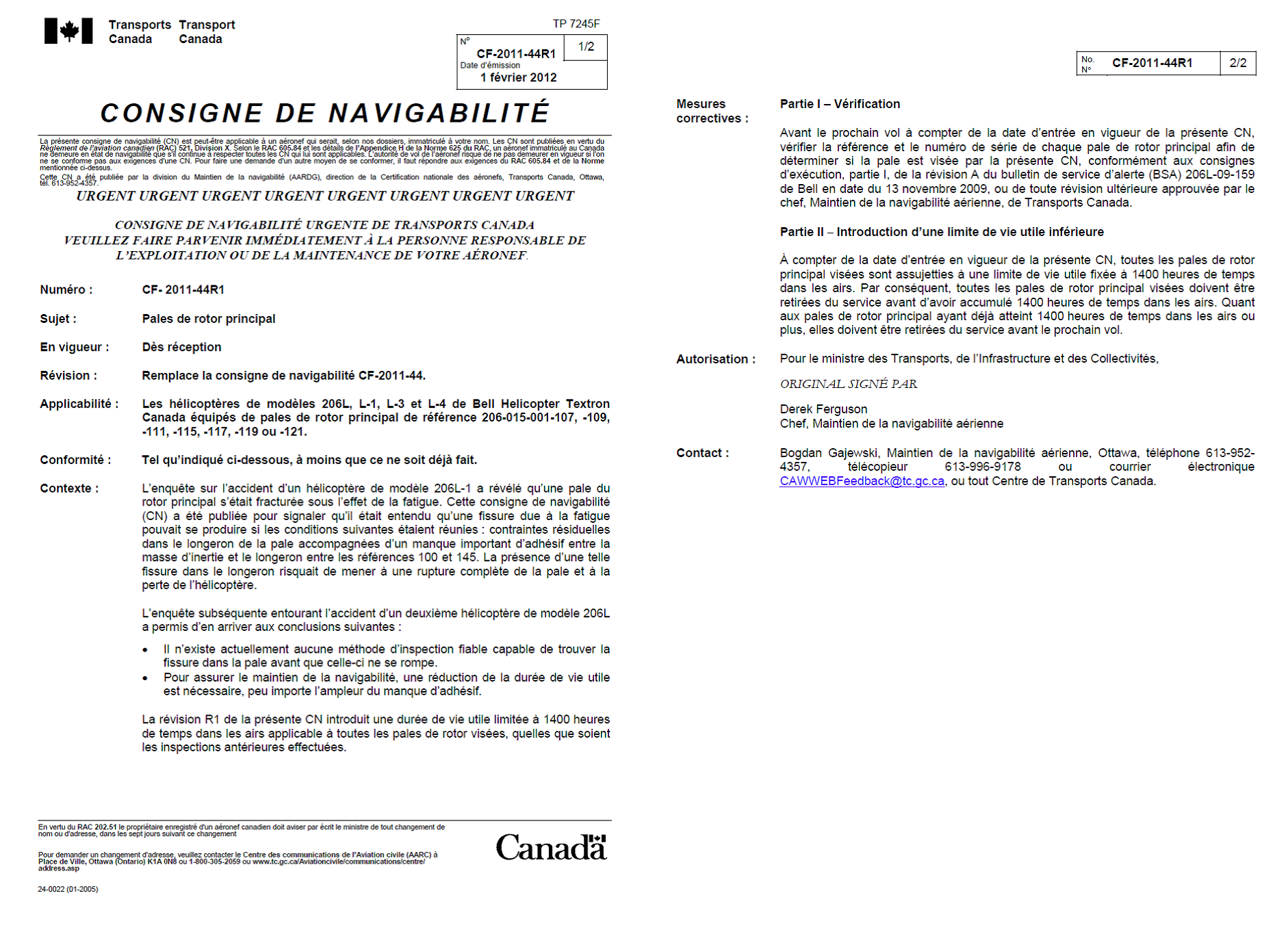 Le 1er février 2012, TC a révisé la CN CF-2011-44. La CN révisée stipule qu’il n’existe aucune méthode d’inspection fiable capable de déceler des fissures dans une pale avant que celle-ci ne se rompe; ainsi, pour assurer le maintien de la navigabilité, une réduction de la durée de vie utile est nécessaire, peu importe la quantité d’adhésif manquant. La révision a introduit une durée de vie utile limitée à 1400 heures de temps de vol qui s’applique à toutes les pales de rotor visées, quelles que soient les inspections antérieures effectuées. Par conséquent, on a exigé le retrait du service de toutes les pales de rotor principal visées avant qu’elles aient cumulé 1400 heures de temps de vol. Dans le cas des pales de rotor principal qui ont cumulé 1400 heures de vol ou plus, elles devaient être retirées du service avant le prochain vol.