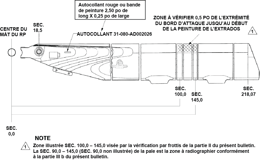 - Partie I : Instructions pour déceler les pales de rotor principal touchées et marquer la surface supérieure à l’aide d’un marqueur permanent afin de déterminer les sections 100 et 145 de la pale.
