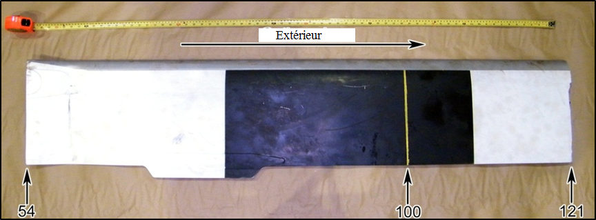 Le dessus de la section intérieure de la pale rompue était marqué d’une ligne peinte en jaune dans le sens de la corde à la section 100 de la pale (photo 1). La section extérieure de la pale rompue n’ayant pas été récupérée, il n’a pas été possible de déterminer si la section 145 de la pale avait été marquée. L’autre pale était marquée aux sections appropriées, en conformité avec le BSA.