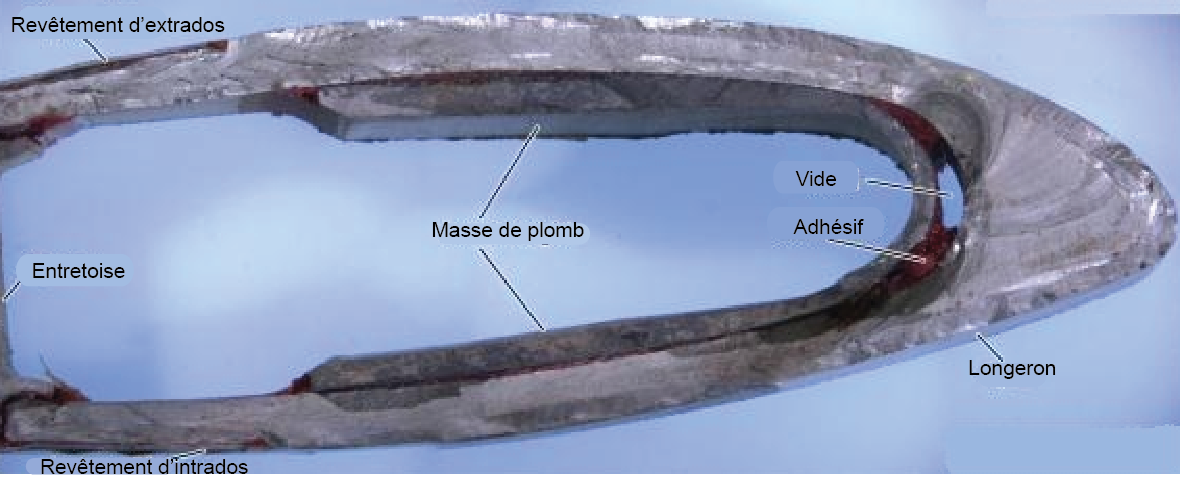 Les rebords de la masse de plomb de l’autre pale étaient complètement scellés. Par conséquent, contrairement à l’adhésif de la pale en cause, les cavités de l’adhésif ne communiquaient pas avec la cavité interne de la pale et il n’y avait aucun signe de corrosion. Le longeron de l’autre pale n’était pas fissuré, même s’il y avait une grande cavité dans l’adhésif entre le longeron et la masse de plomb à mi-longueur.