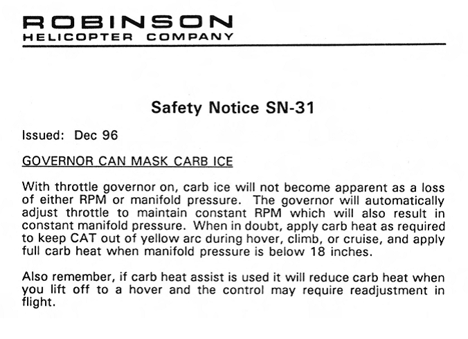 - SN-31 – Le régulateur des gaz peut masquer le givrage du carburateur