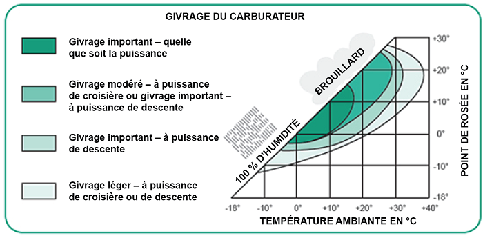 Le givrage du carburateur se produit lorsque la température de l’air entrant dans le carburateur est réduite en raison de l’évaporation du carburant et de la diminution de la pression d’air provoquée par l’effet Venturi. Si la vapeur d’eau contenue dans l’air se condense lorsque la température du carburateur est égale ou inférieure au point de congélation, il peut se former de la glace sur les surfaces internes du carburateur, notamment la soupape de la manette de commande des gaz. La formation de glace accentue le refroidissement causé par l’effet Venturi en raison du rétrécissement de la cavité du carburateur; ce rétrécissement entraîne également une réduction de la puissance de sortie. Si rien n’est fait, la glace peut rapidement causer une panne complète du moteur. Pour éviter le problème de givrage du carburateur, les fabricants installent un système visant à réchauffer l’air entrant et à prévenir l’accumulation de glace.