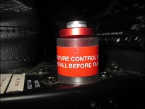 La commande de mélange air/carburant et celle du réchauffeur du carburateur sont situées sur la console centrale à proximité l’une de l’autre. Afin de les distinguer plus facilement, les manettes de commande ont une forme différente. En outre, la manette de commande de mélange air/carburant est rouge tandis que celui de la commande du réchauffeur du carburateur est noir (photo 1). Afin d’éviter qu’il soit actionné par inadvertance en vol, la liste de vérification du fabricant recommande fortement au pilote de placer un protecteur cylindrique en plastique amovible sur la manette de commande de mélange air/carburant avant de lancer le moteur (photo 2). Ce protecteur ne doit pas être retiré avant de procéder à l’arrêt du moteur en tirant sur la manette de commande de mélange air/carburant jusqu’en position étouffoir (photo 3). Ce protecteur en plastique n’est pas fixé en permanence au panneau de contrôle.