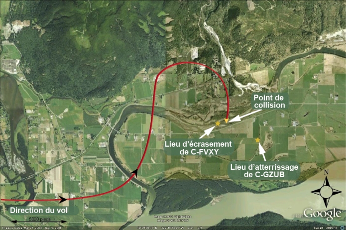 Vers 16 h, heure normale du Pacifique, à la clarté du jour, un groupe composé de 4 aéronefs légers a décollé depuis l'aéroport régional de Langley (Colombie-Britannique) pour effectuer un vol local en formation à destination de Chilliwack. Vers 16 h 15, pendant que le groupe effectuait un virage, le Cessna 150G (immatriculé C-FVXY, numéro de série 15066711) et le Cessna 150L (immatriculé C-GZUB, numéro de série 15074143) sont entrés en collision. Les 2 aéronefs ont brièvement chuté de façon non maîtrisée alors qu'ils étaient joints, pour se séparer à environ 400 pieds au-dessus du sol. C-FVXY s'est disloqué en vol et a percuté le relief dans un bourbier peu profond; les 2 occupants ont subi des blessures mortelles et l'aéronef a été détruit. Le pilote de C-GZUB a réussi à maîtriser l'aéronef et a pu atterrir dans un champ agricole sans subir de blessures; toutefois, l'aéronef a été lourdement endommagé à la suite de la collision. Il n'y a pas eu d'incendie et la radiobalise de repérage d'urgence à bord de C-FVXY s'est activée à l'impact avec le bourbier.