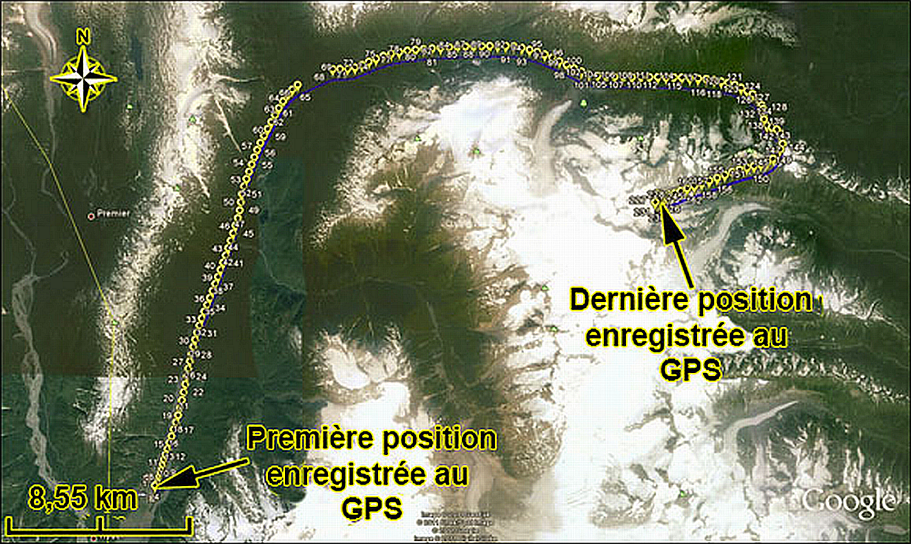 Les 2 dernières minutes de données enregistrées à partir du GPS portatif indiquent que la position et l’altitude de l’hélicoptère étaient stationnaires pendant 54 secondes avant l’interruption de l’alimentation électrique ou la perte du signal GPS. Le compte rendu de position suivant aurait été enregistré 6 secondes plus tard.